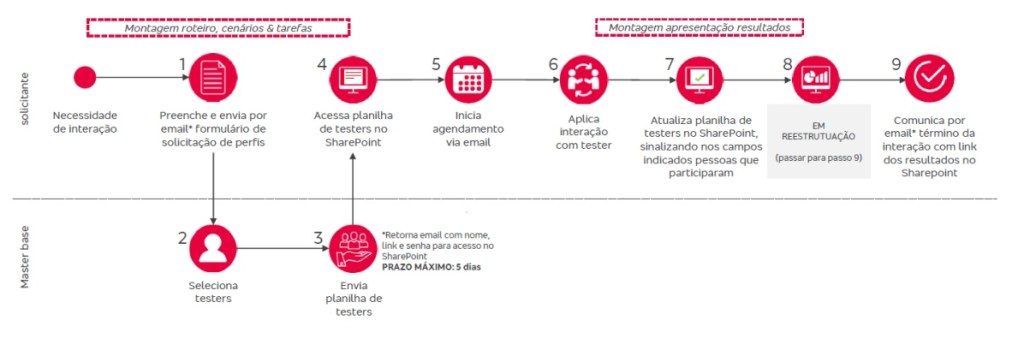 Através da estrutura da Seguradora, estabelecemos dinâmicas de testes de usabilidade moderada, em diversas etapas do desenvolvimento dos protótipos para validação através das deguintes métricas: